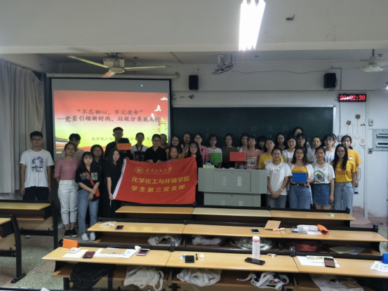 学生第三党支部按照习近平总书记对垃圾分类工作的重要指示,结合“不忘初心、牢记使命”主题教育工作部署和化学专业特色开展了“党员引领新时尚,垃圾分类我先行”的主题党日活动。
