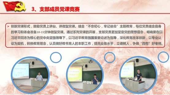 在严格落实“三会一课”制度,深入开展“支部书记、委员好党课”和“支部党员党课竞赛”。支部书记和委员结合自身学习、科研及工作实际给支部全体党员讲党课。每位党员结合自身的学习和体会准备10-15分钟微型党课,轮流上台讲课。充分发挥党支部书记“双带头人”作用,将党建工作与学校、学院教学、科研、学科建设相结合,促进教学、科研等工作取得新成果。