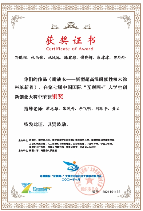 支部蔡志雄老师指导的《耐战衣——超高温耐候性粉末涂料革新者》项目荣获第七届“互联网+”大学生创新创业大赛国赛铜奖、省赛金奖。