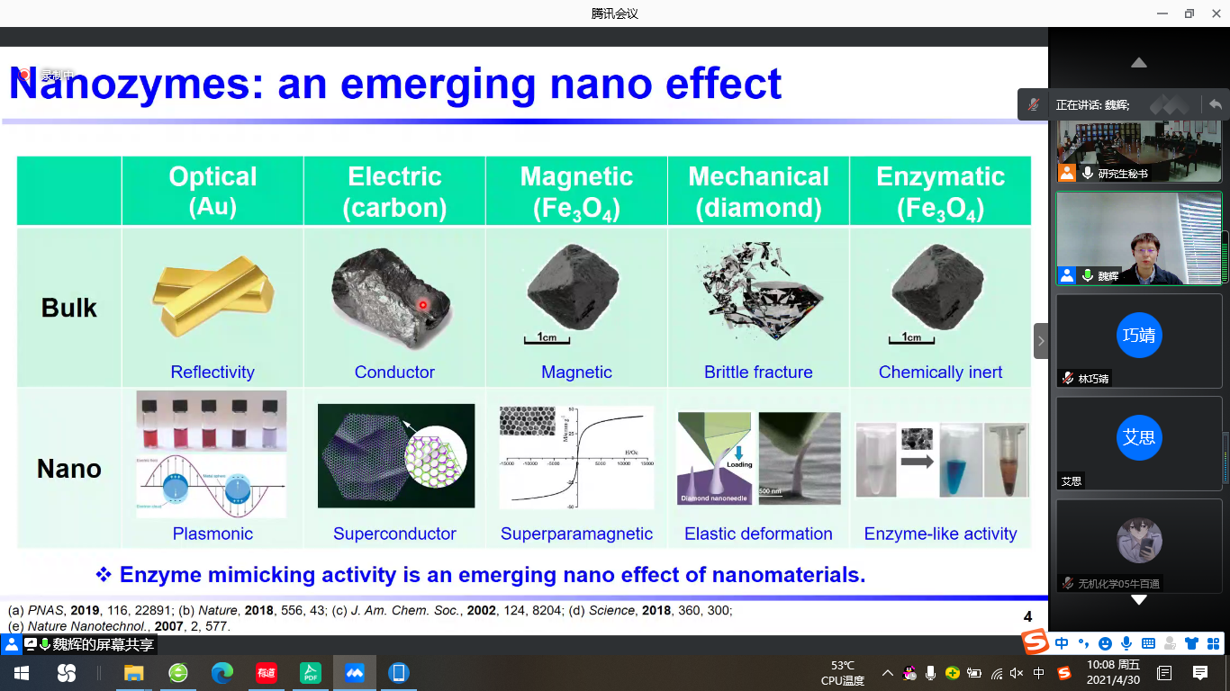报告中,魏辉教授首先从纳米材料模仿天然酶的功能出发,介绍了纳米酶的发展及其与天然酶、其他模拟酶的对比。其次,魏辉教授介绍了纳米酶的广泛应用,如生物分析、生物成像、疾病治疗、环境保护等领域。并且详细介绍了纳米酶从模型体系、材料的设计合成、通过“试错法”最终应用在生物医学领域的发展历程。最后,魏辉教授分享了其课题组的工作及研究进展。