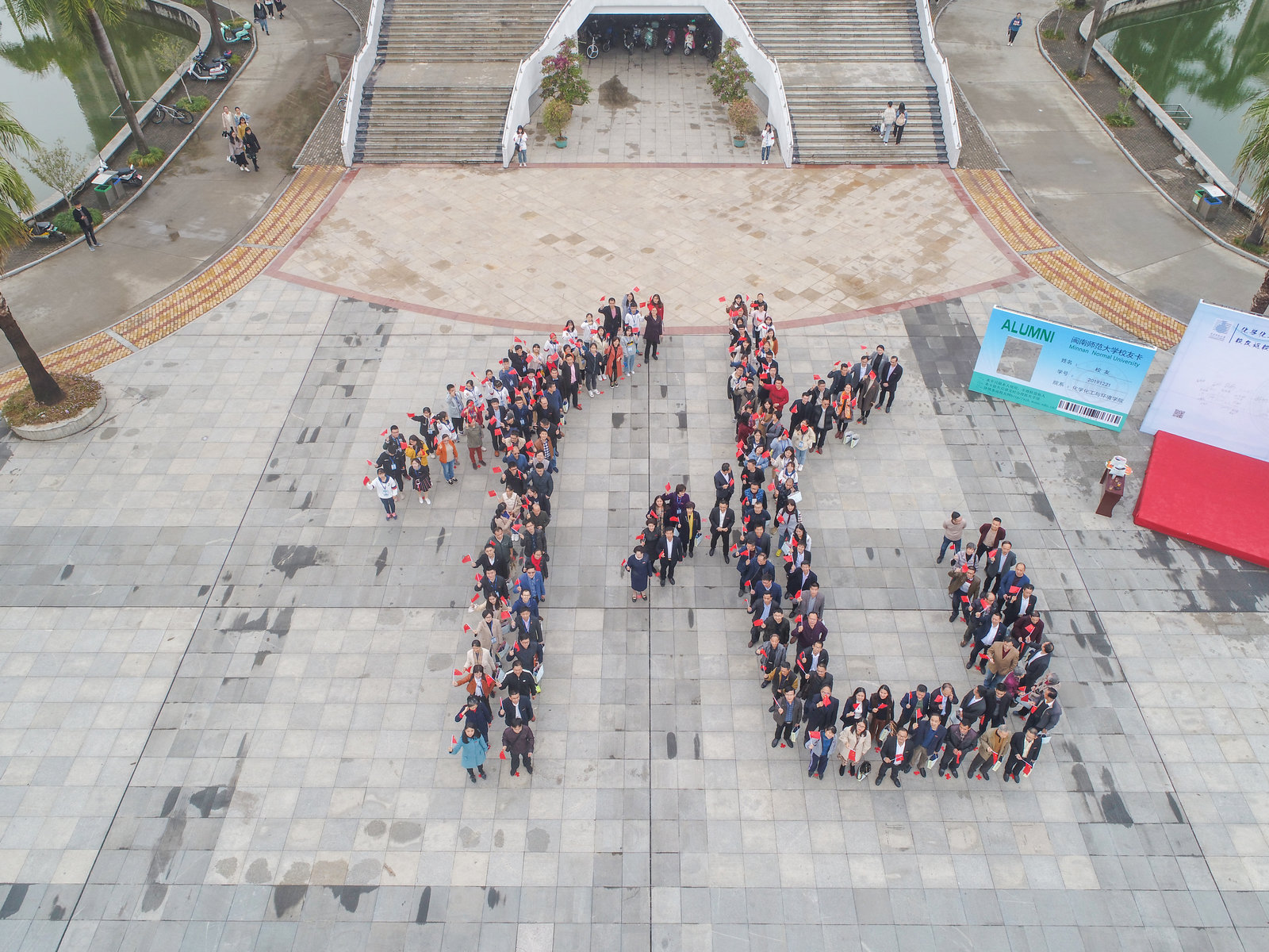 为了更好地向母校致敬,渲染浓厚的庆祝氛围,上午9:30许,学院创意十足的将到场的200多名嘉宾、校友组成了一个大大的“化”字,宣誓着化学人不变的初心与使命。