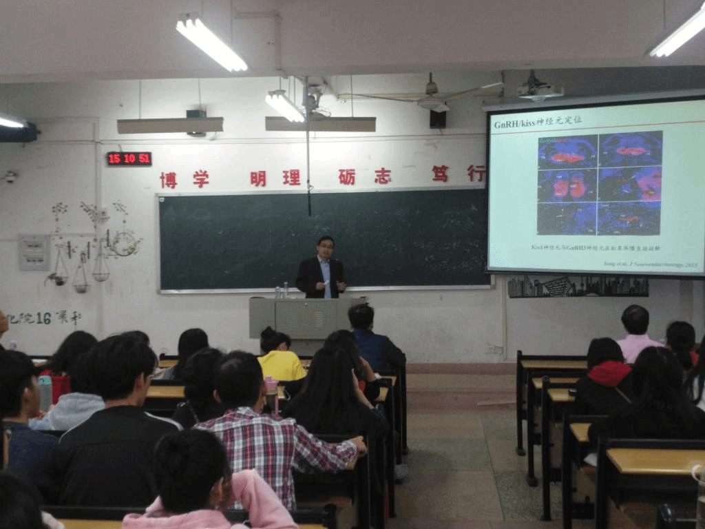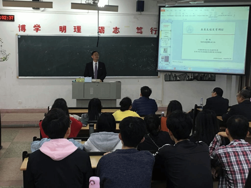 胡炜研究员围绕鱼类生殖发育调控等方面进行了讲解。胡炜研究员凭着自己多年的科研经和独特的学术见解,给学生讲解及分析了许多科研过程以及取得的成果,通过对斑马鱼脑垂体的研究、对斑马鱼的mRNA进行m6A甲基化修饰;对其进行生殖发育调控,从而培育优良品种。