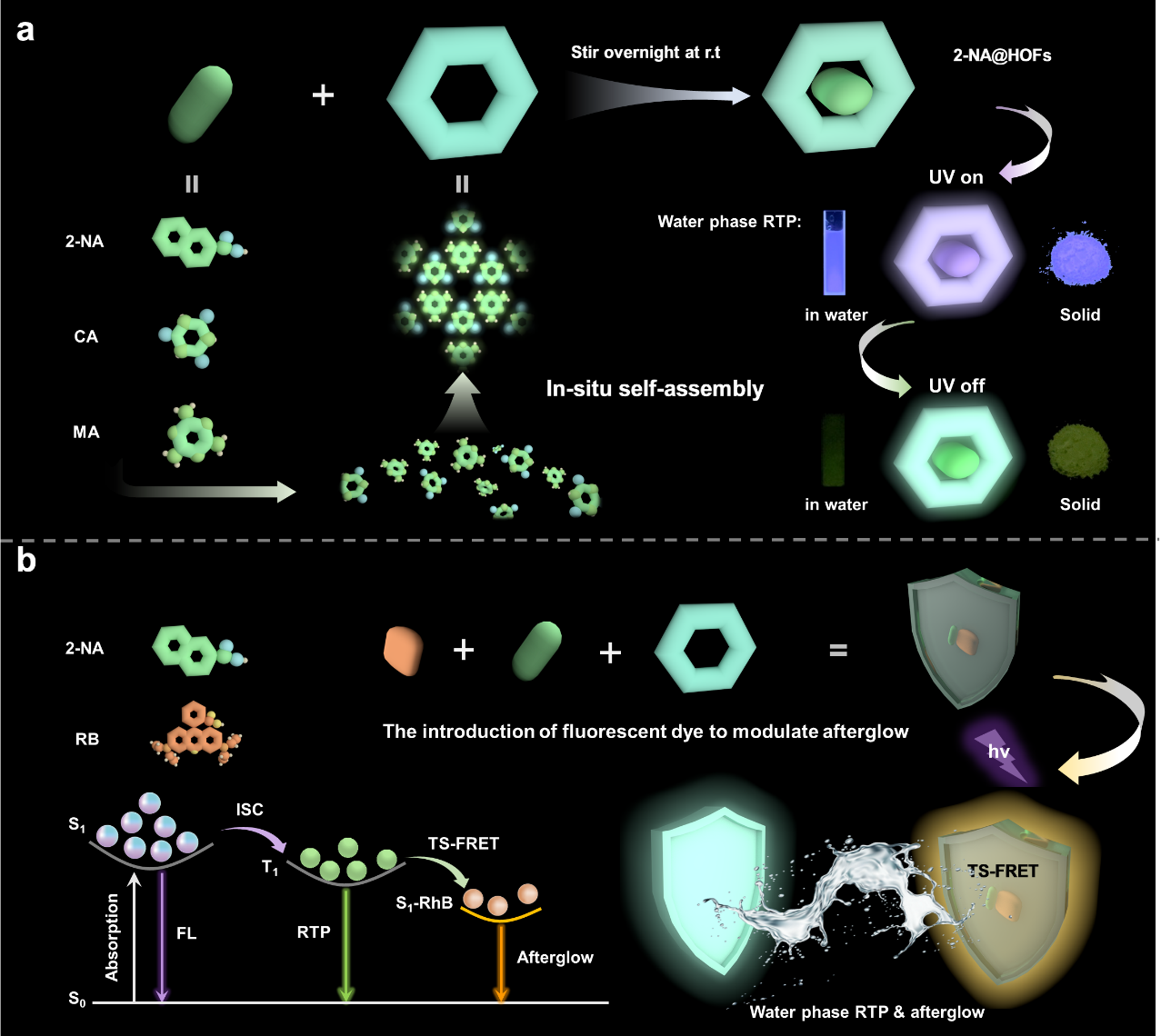HOF基RTP材料构建及TS-FRET示意图