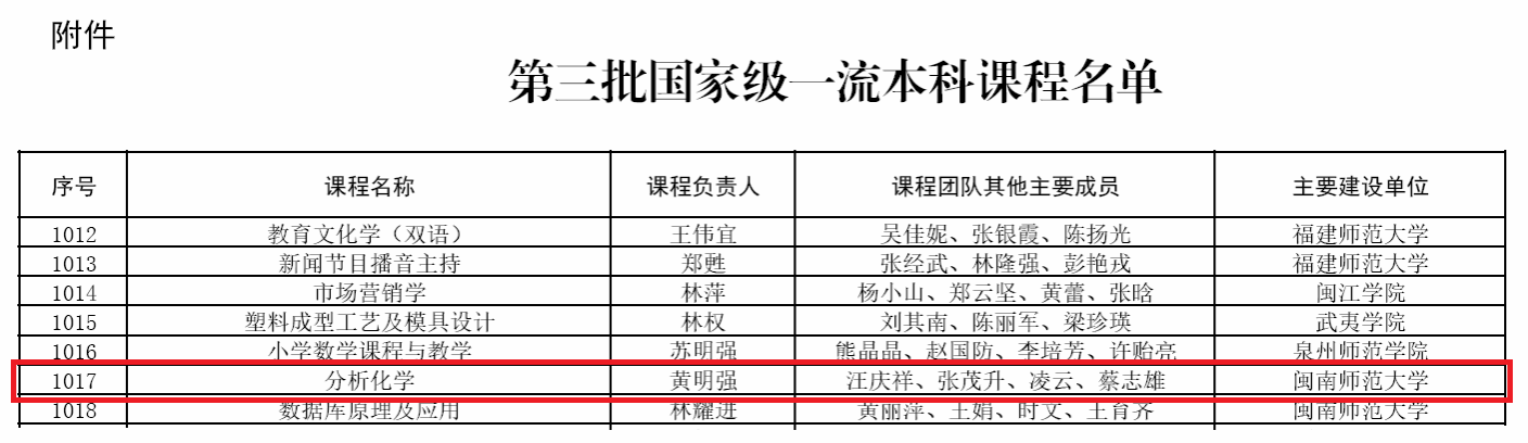 近日,教育部印发《教育部关于公布第三批国家级一流本科课程认定结果的通知》(教高函〔2025〕9号),正式公布第三批国家级一流本科课程名单。我院黄明强教授负责的《分析化学》课程成功入选,实现了我院国家级一流本科课程“零”的突破。