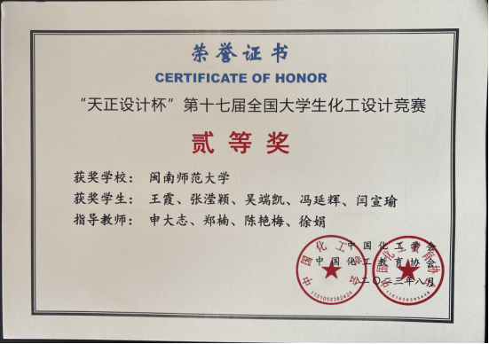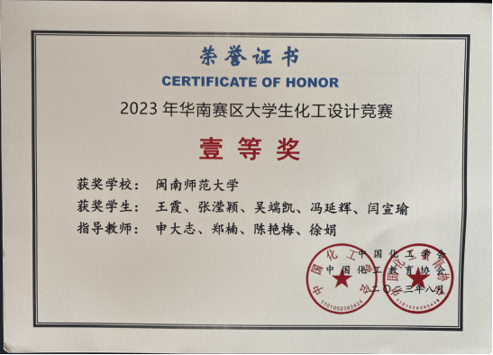 近日,由我院2020级应用化学专业的王霞、张滢颖、冯延辉、吴端凯、闫宣瑜5名本科生组成的“山水庄园”团队,在申大志、郑楠、陈艳梅和徐娟4位指导老师的悉心指导下,在第十七届全国大学生化工设计竞赛中最终斩获佳绩,获得全国二等奖、华南赛区一等奖。