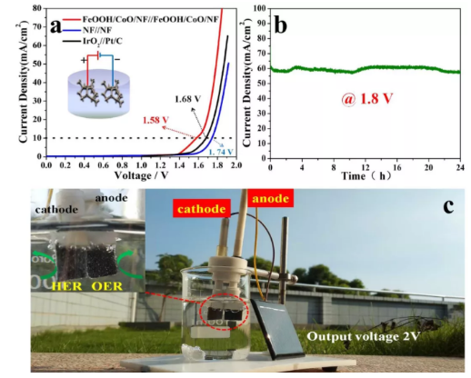 最近,我院汪庆祥教授团队与新南威尔士大学赵川教授团队合作,通过简单、快速的浸渍法在CoO修饰的泡沫镍(NF)基底上原位制备了一种具有异相界面的FeOOH/CoO纳米针阵列。研究团队通过改变Fe3+溶液浸泡时间控制FeOOH/CoO纳米针阵列相界面组成和形貌,结果显示,在5min浸泡时间下得到的FeOOH/CoO保持了CoO纳米针形貌和均匀统一的两相界面组成,且在碱性介质中表现出最佳的析氢、析氧双功能催化性能。机理研究表明,FeOOH/CoO相间的电子耦合效应是该催化剂具有高活性的重要原因。将该双功能催化剂应用于两电极全解水实验中,仅需1.58V的电压即可获得10 mA cm-2的电流密度,优于贵金属催化剂IrO2//Pt/C(1.68V)。用市售2 V太阳能电池板作为电能输出装置,能获得稳定太阳能电解水效果。该简便、快速的界面工程策略为设计高效的电解水制氢催化剂提供了新的思路。