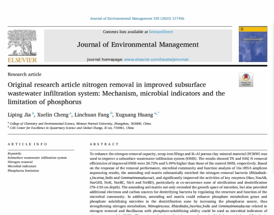 相关成果以“Nitrogen removal in improved subsurface wastewater infiltration system: mechanism, microbial indicators and the limitation of phosphorus”为题发表在国际著名期刊Journal of Environmental Management 上(中国科学院分区一区,IF=8.91,335 (2023) 117456)。我院贾丽萍老师为该论文的第一作者,黄旭光教授为该论文的独立通讯作者。
