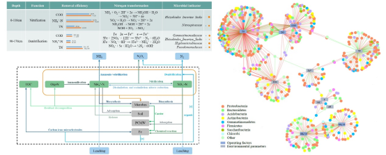 基于此,课题组采用废铁屑和Si-Al系多孔粘土矿物材料改良SWIS土壤基质。改良土壤基质富集了功能菌,增强了脱氮关键酶的活性,显著提高了SWIS的脱氮性能。此外,DO、Fe2+、TOC、TN、NO3--N和NH4+-N可以通过改变微生物群落结构和功能来加强氮代谢,可作为SWIS启动、应用和监测的理化指标。铁不仅可以通过化学反应增强反硝化性能,还可以与TOC构成碳-铁微电极,为反硝化细菌提供额外的碳源和电子,从而强化反硝化作用。同时,改良SWIS中磷代谢基因和溶磷细菌的增加提供了更多的生物可利用磷,减缓了磷缺失对反硝化的限制。此外,脱氮微生物Nitrospiraceae、Rhizobiales_Incertae_Sedis和Gemmatimonadaceae,以及具有溶磷能力的Bacillaceae,可作为SWIS脱氮的指示微生物。由此,不仅为SWIS处理分散式生活污水提供了一种低成本、高效的增强途径,并为后续应用提供了理论支持。