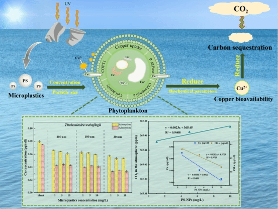 该研究评估了聚苯乙烯纳米颗粒(PS-NPs)对铜生物利用性和藻类固碳能力的影响。结果表明,PS-NPs会抑制威氏海链藻和蛋白核小球藻的生长。藻类对铜的吸收量与铜转入蛋白COPT1呈显著负相关,而与铜转出蛋白P-ATPase呈显著正相关。该研究发现,PS-NPs暴露会降低藻类对铜的吸收进而降低藻类的固碳能力,当PS-NPs浓度每增加1 mg/L,藻类固定CO2的浓度降低0.0023 ppm。这为揭示PS-NPs对铜生物地球化学循环与碳源汇关系的影响机制提供了新的视角。