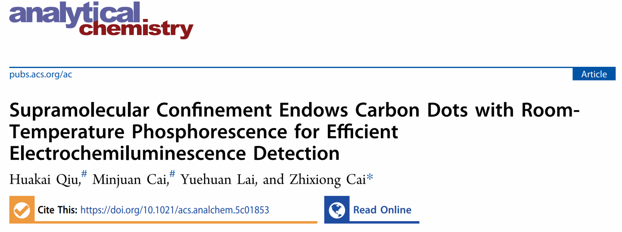 近日,我院MOOM团队蔡志雄课题组在碳点基室温磷光材料用于高效电化学发光检测取得重要进展,相关研究成果以Supramolecular Confinement Endow Carbon Dots with Room-temperature Phosphorescence for efficient Electrochemiluminescence Detection为题发表在分析化学领域权威期刊《Analytical Chemistry》(中科院一区TOP期刊)