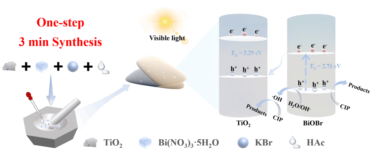在光催化处理含抗生素废水方面,团队研究取得新的进展。其一,开发了TiO2-BiOBr复合光催化体系,通过3 分钟研磨制备TiO2-BiOBr,显著优化了材料界面结构,极大提升了其在可见光下对多种典型抗生素的降解效率,为规模化制备高效可见光催化剂提供了简便策略 (Journal of Alloys and Compounds 1036 (2025) 181882)。其二,创新性地将镁基层状双氢氧化物(MgM-LDHs)应用于水处理领域,发现其能够同时高效去除水体中的磷化合物(如磷酸盐)并降解多种抗生素,实现污染物的协同去除,拓宽了LDHs材料的应用场景 (Journal of Photochemistry & Photobiology, A: Chemistry 464 (2025) 116329)。