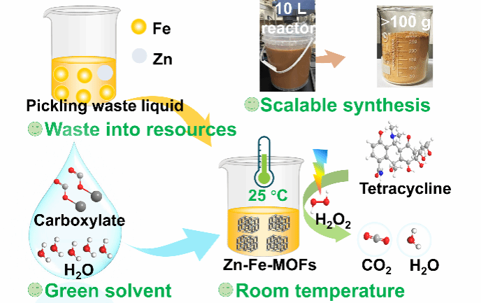 针对有机与无机废物的资源化利用及水体抗生素污染治理难题,团队实现工业废物到高性能催化剂的绿色升级。利用镀锌酸洗废液(含铁/锌)和废弃PET塑料提取的对苯二甲酸,在室温1小时内成功合成MIL-88B(Fe)材料,通过光辅助活化过一硫酸盐,高效降解四环素,实现“以废治废”(Inorganic Chemistry 64 (2025) 2040−2051)。此外,团队进一步将将镀锌酸洗废液转化为Zn/Fe双金属MOFs(单批次>100克),合成方法具有可持续、可规模化、条件温和(室温、水溶液)的核心优势,有效降低了传统MOF合成的能耗与成本;锌掺杂显著提升光生载流子分离效率, 40分钟可完全降解抗生素,且该体系适应实际的养殖尾水、污水处理厂出水、河水等复杂水体(Journal of Environmental Chemical Engineering 2025. https://doi.org/10.1016/j.jece.2025.118626)。