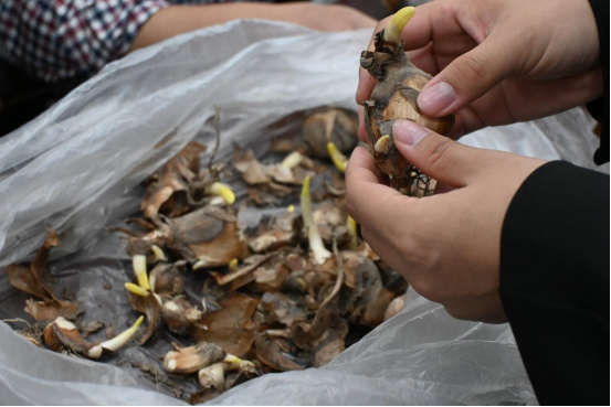 在张文江先生的指导下,同学们纷纷动手实践。如何去雕刻?一般步骤分为净化、开盖、疏隙、剥苞、削叶、刮梗、雕刻侧鳞茎和修整八个步骤。同学们一边聆听讲解,一边认真练习。虽然刚开始有些生涩,但在两位老师的悉心指导下,大家逐渐找到了手感。水仙花球雕刻完成后,将脱脂棉片盖住切口和根部,放入清水中养护,每天换水,四五天后再开始晒太阳。