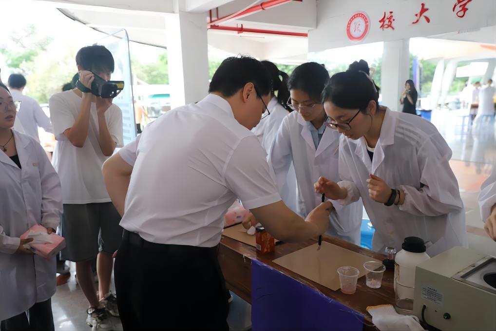 校党委副书记林致远和同学们亲切地打招呼,并一一了解本届科学嘉年华的项目,体验了火焰掌、水火箭发射、磷光防伪,用热冰书法提字,感叹晴雨花的美妙,了解传统工艺与现代技术相融合的蓝晒,制作香水并分享了他对于香水的认知......最后,林致远副书记针对本次活动和同学们交流想法,也为后续科活动的举办提供了可借鉴的思路,师生们其乐融融。