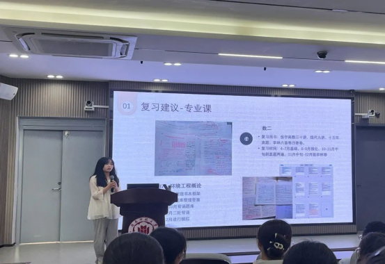 经验分享环节中,四位成功考取研究生的学长学姐一一向大家分享他们宝贵的经验。环境科学专业的王振锋同学从择校、院校信息获取、学科复习方法、心态调节等几个方面进行详细介绍,并给予同学们一些在备考路上的小tips。